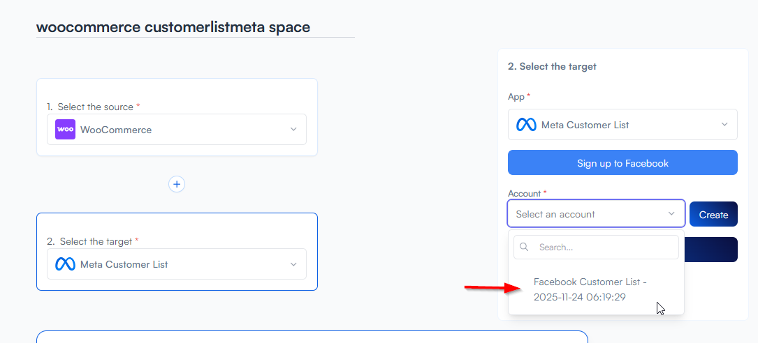 Step 7 Select the Meta customer list account you created earlier while setting up your app credentials.